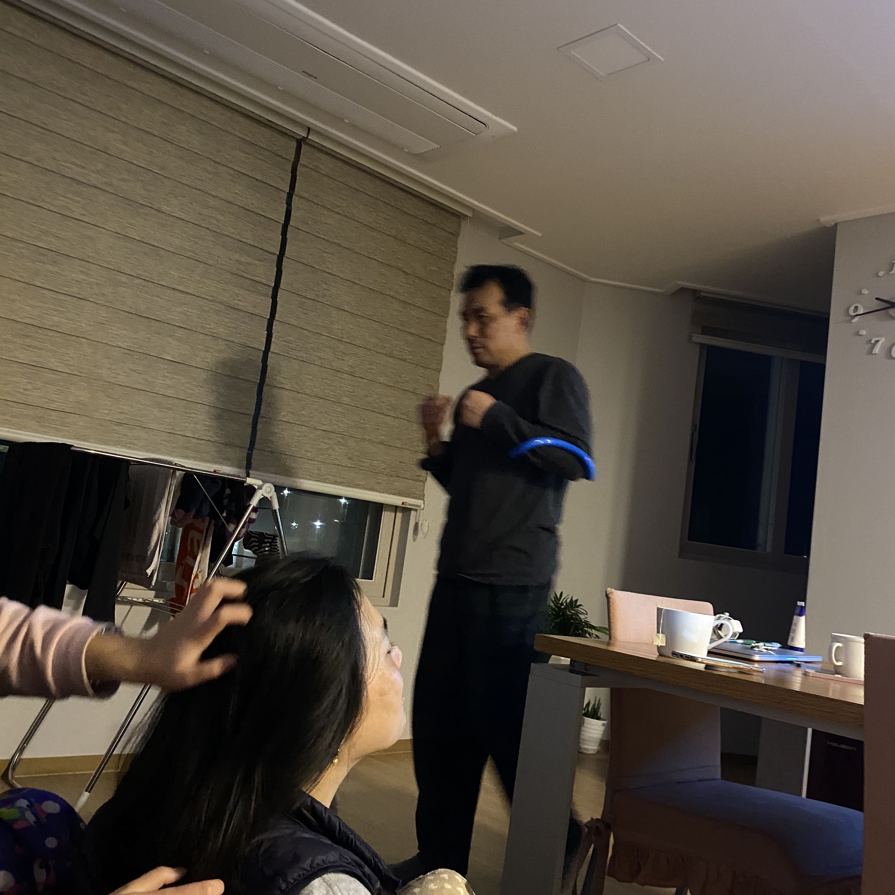 팔에 요가링끼고 권투하는 아빠
